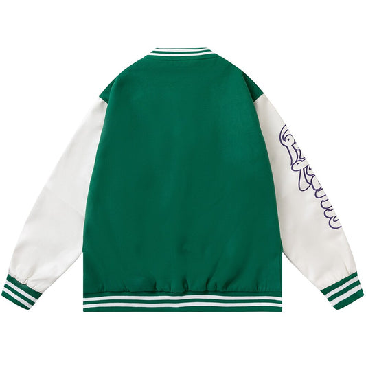 Patchwork Color Furry Embroidery Baseball Jackets Men Autumn Vintage High Street Harajuku Baggy Bomber Coats Streetwear