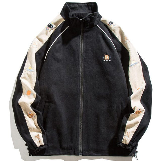 Zipper Jacket Men Robot Embroidery Patchwork Color Varsity Coat Couple Fashion Harajuku College Style Streetwear Autumn